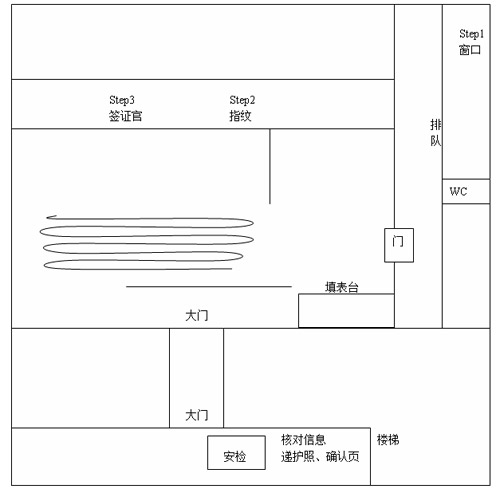 6、往前走右拐出大门,通过露天走廊,进下一个大门,这才是真正的签证大厅。