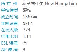 学校历史悠久,注重培养学生的人格、独立能力、责任心以及同情心;学校安全保卫措施好。 小班教学,个性化的教育项目提高个人关注度;高水平的学术能力为学生日后走出校园做好准备。 学校为学生提供丰富的学术课程,包括大学预备课程(9门AP课程,19门荣誉课程)、基础教育课程以及职业课程。学校多次在州际考试中取得前三名的好成绩。优良的教学传统和丰富的教学经验获得全美历史最为悠久的地区学术协会“新英格兰学校联会”的认证,还被新罕布什尔州教育委员会评为优质高中。 课外生活丰富多彩,学校积极鼓励学生参加音乐、艺术、运动以及其它的学生俱乐部。