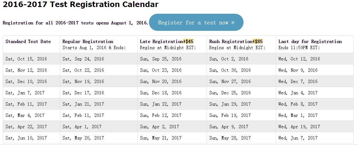 2016-17最新SSAT考试时间安排