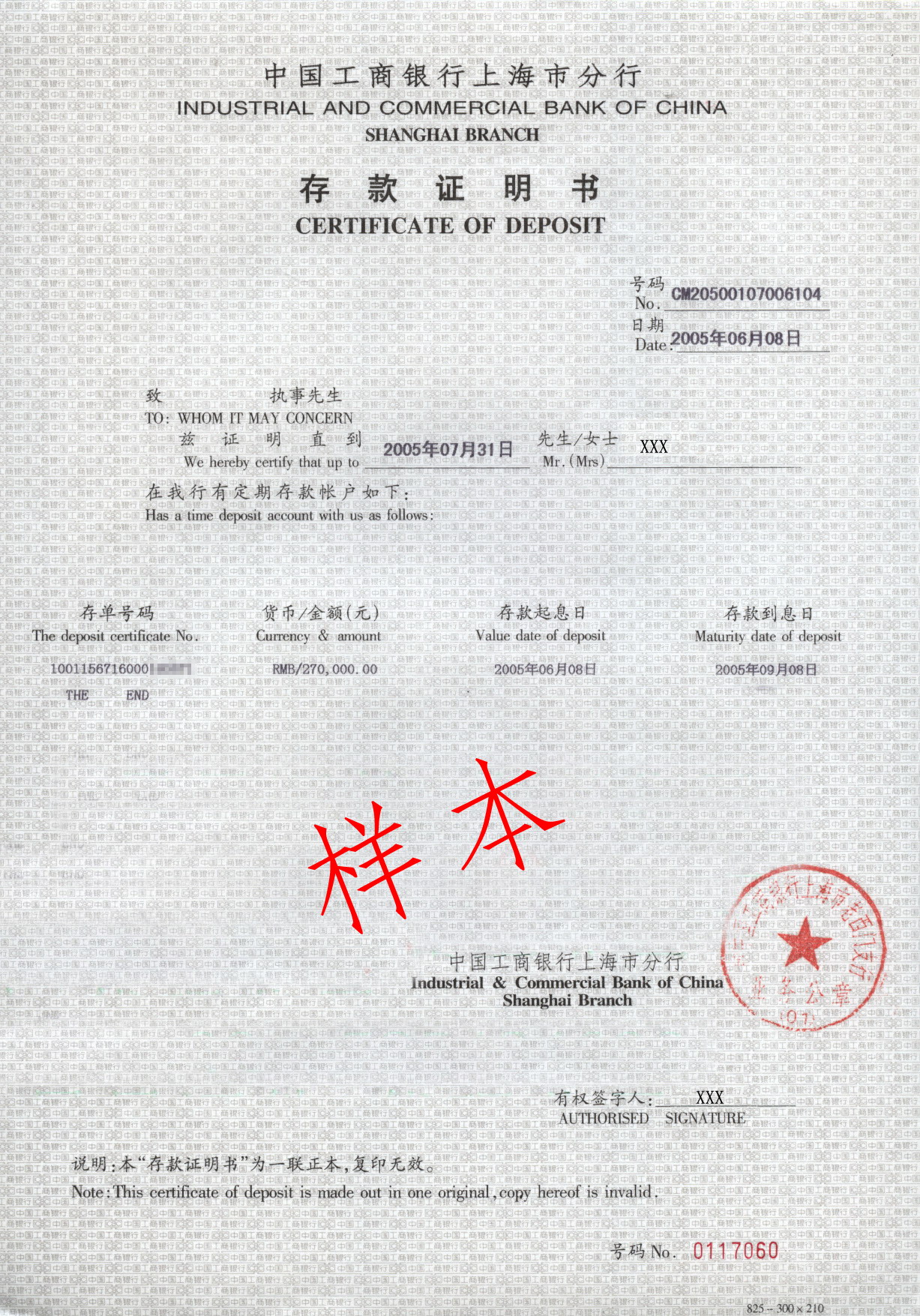 2、存款证明书上要有开具人的签字,同时是中英文对照,户主名字使用拼音。