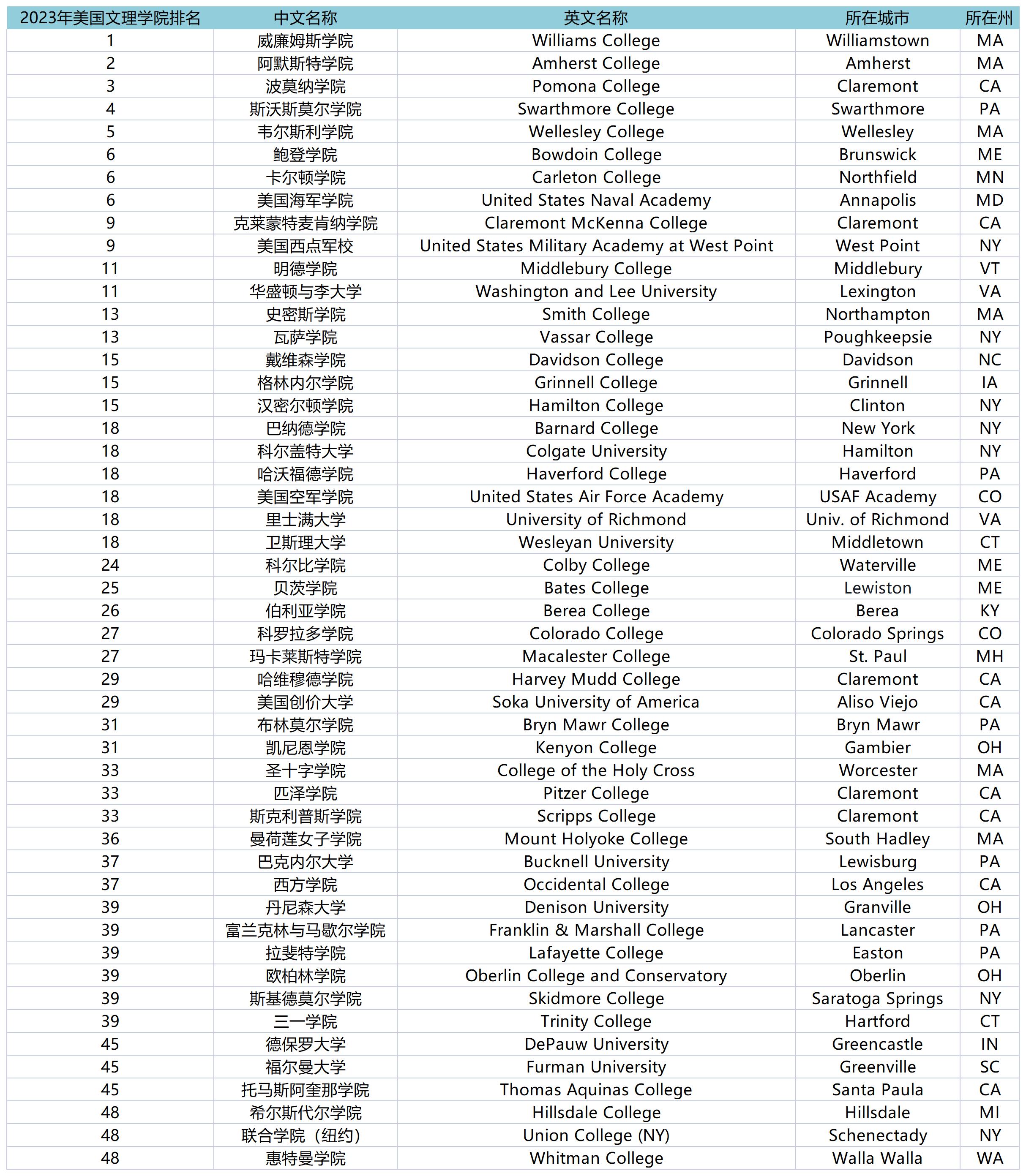 美国文理学院排名前50