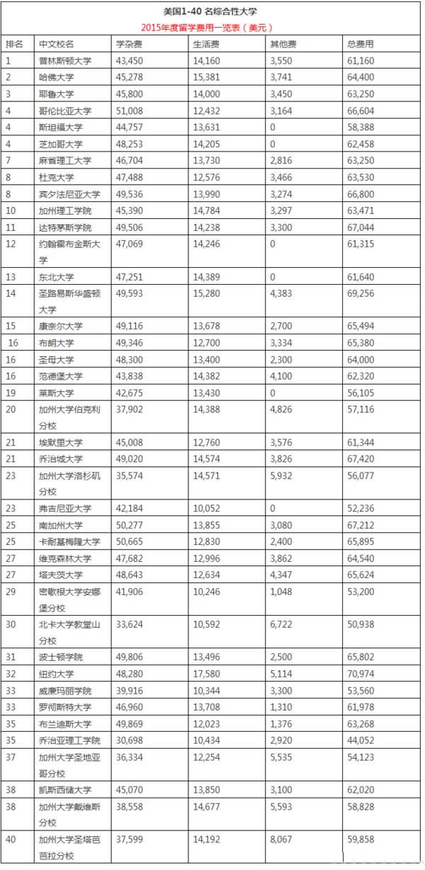 下表提供了美国 1-40 名综合性大学 2015 年度的留学费用,其数据几乎都来自于各个大学的官方网站,因此是最新、最准确的数据。