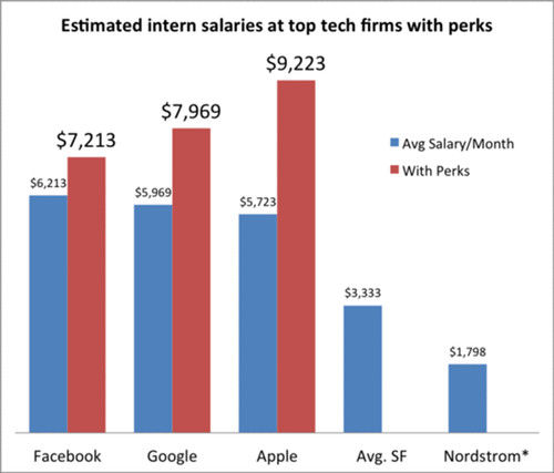 其中不包含津贴的情况下,Facebook实习生月薪最高,达到6213美元,而包含各种住房补贴、消费津贴后,苹果的实习生月薪达到9223美元。想象一下实习生月薪收入超过人民币五万元,这在国内估计是想都不用想啊,当然消费水平以及物价都不同,但依然很高。