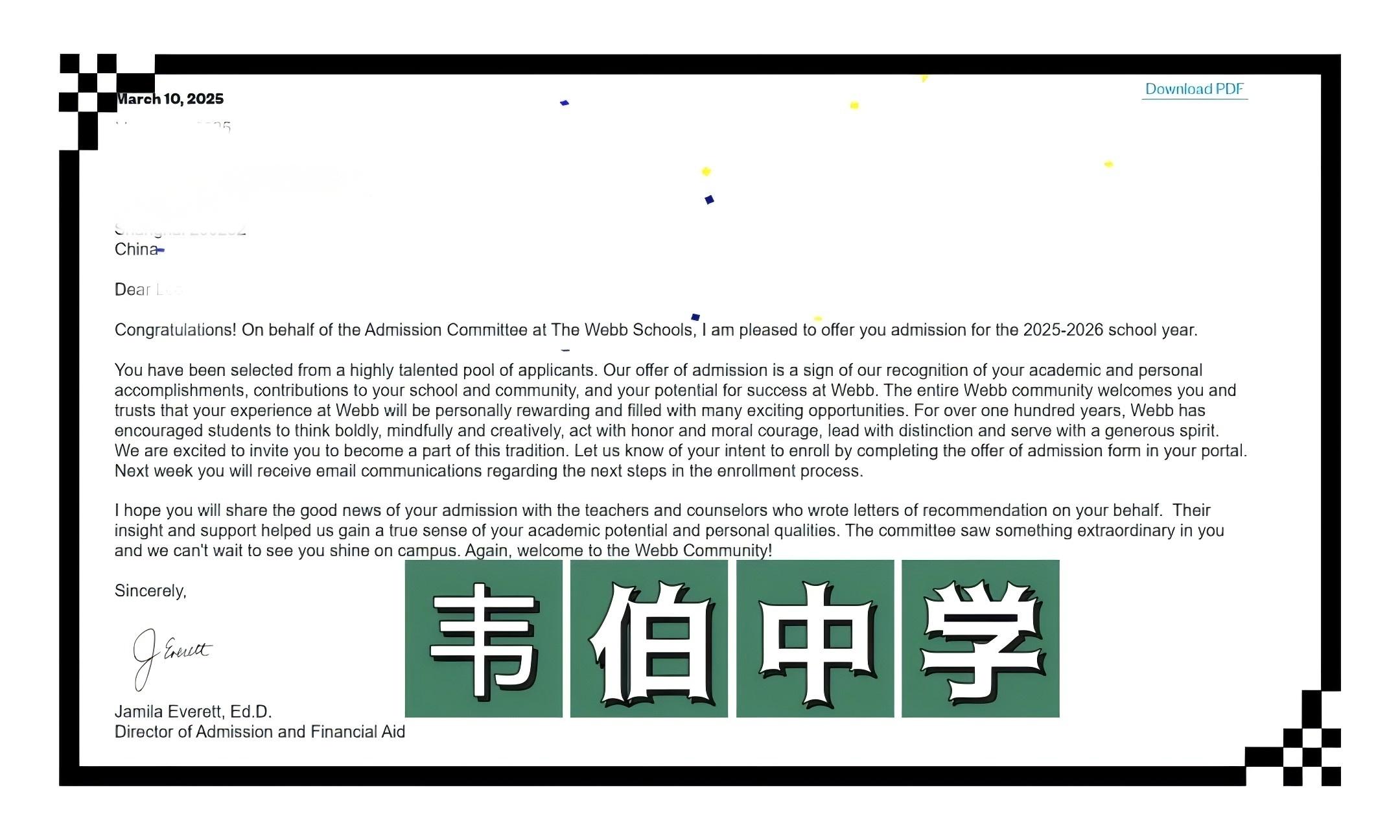 【录取喜报】恭喜留美网学子L同学斩获加州韦伯中学 录取offer