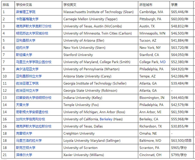 2017年美国USNews管理信息系统专业最新TOP20排名